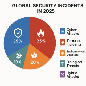 • نمودار دایره‌ای/اینفوگرافیک سهم نسبی هر دسته از حوادث امنیتی در سال 2025 با رنگ‌بندی و آیکون‌های اختصاصی (گلوبال سایبری، تروریسم، زیست‌محیطی، زیستی-پزشکی و هیبرید).
