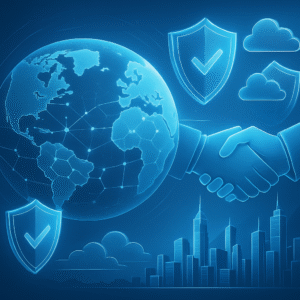 تصویری انتزاعی از شبکه ارتباطی جهانی امنیت، تمرکز بر همگرایی فناوری، تاب‌آوری و مشارکت کشورها